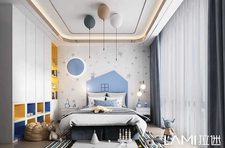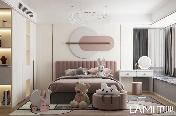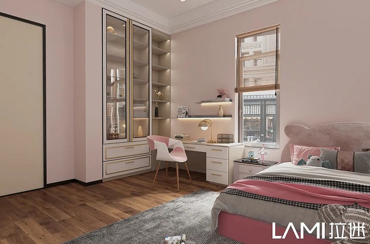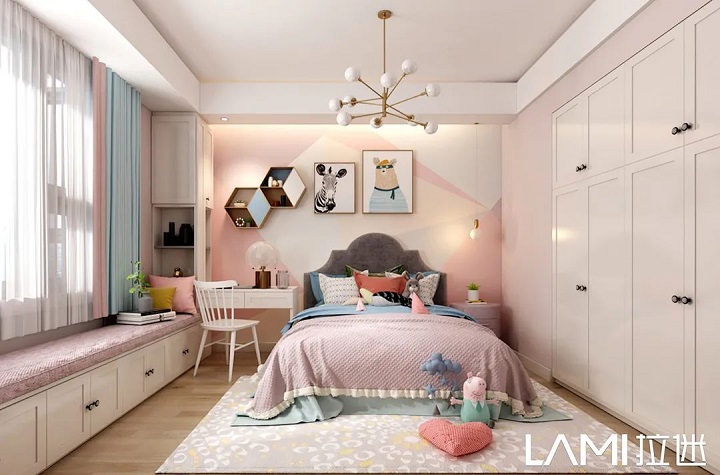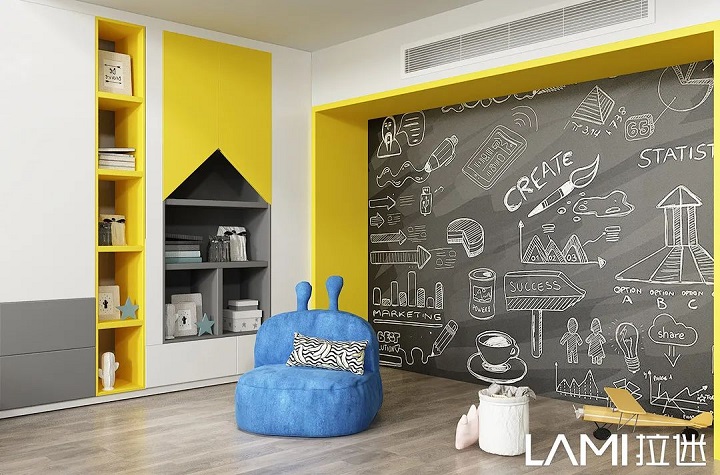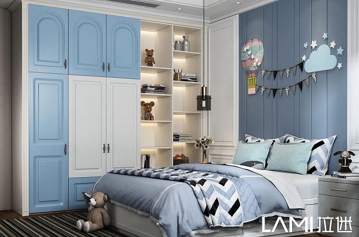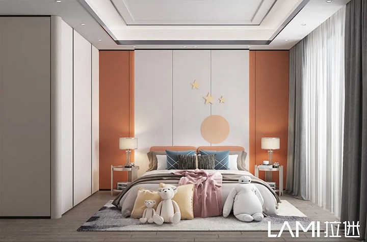 兒童房色彩搭配,拉迷一般采用幾款最接近大自然的板材:佩羅柏木、布格拉灰、伊麗莎白、絨面水藍(lán)等,色彩明亮、自然,對(duì)孩子的視力可以起到舒緩、放松。
