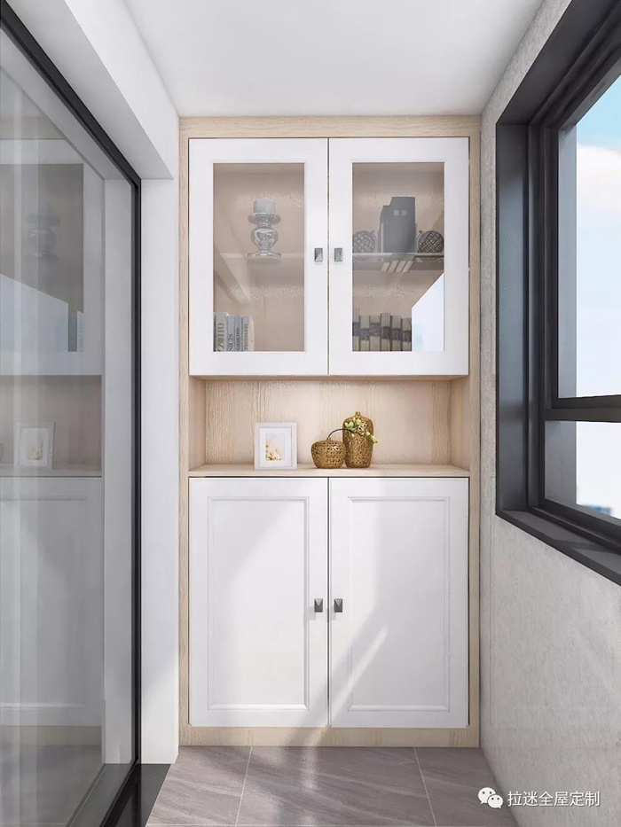 嵌入式柜體,既不占用陽臺的休閑空間,又可以將玄關(guān)裝不下的鞋子或者家里的雜物悉數(shù)收納;