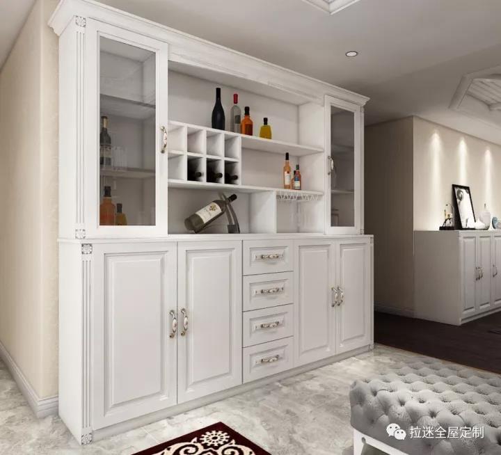 在一些高端的住宅,常見餐廳和客廳之間設(shè)有較大的餐邊柜,上層是存放紅酒、酒杯等設(shè)計(jì)的樣式,下層則是具備儲(chǔ)藏功能的雙開柜設(shè)計(jì)。