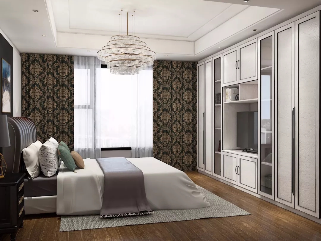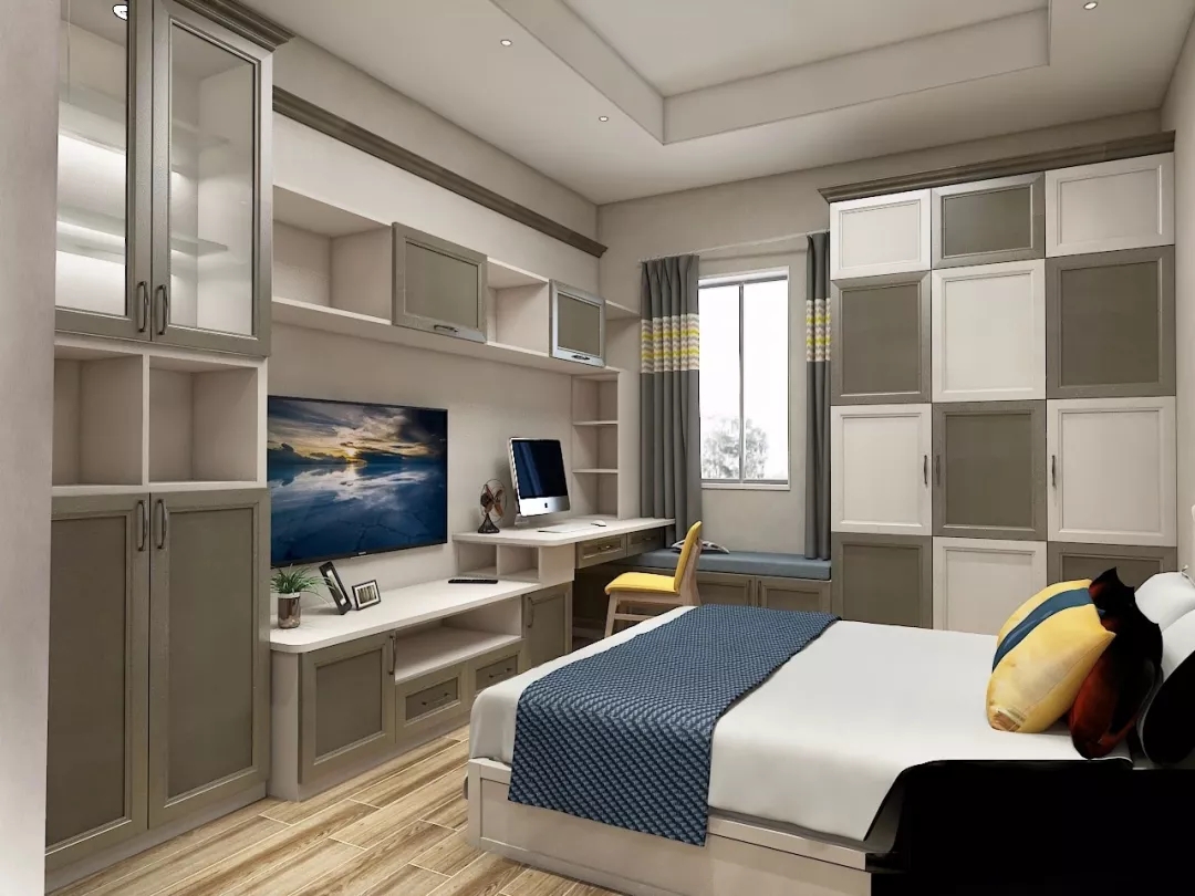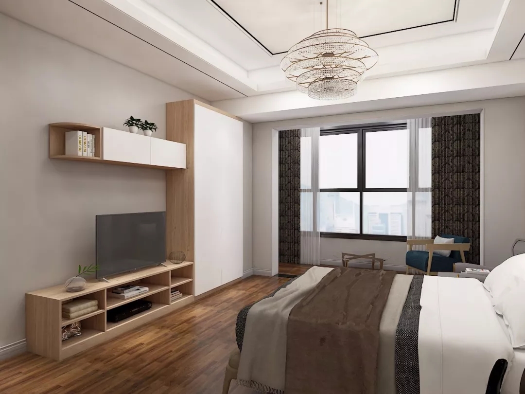 同樣,定制衣柜還可以搭配電視柜。從衣柜側(cè)面延伸出吊柜和地柜,再擺一臺電視機。不僅讓臥室在視覺更加靈巧鮮活,同時也開啟了賴床刷劇的幸福生活!