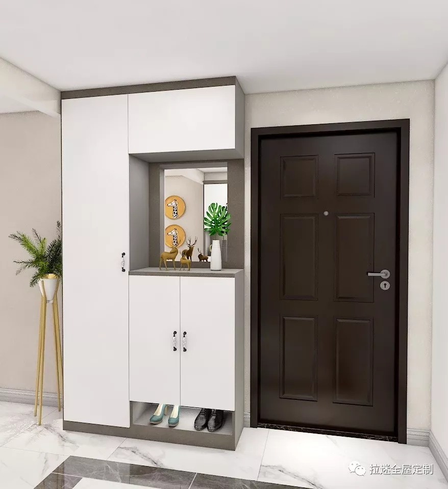 沒有玄關的情況下,可以放置一個隔斷功能的玄關柜,一方面化解了進門看到廳的尷尬,也能解決鞋柜擺放的問題。