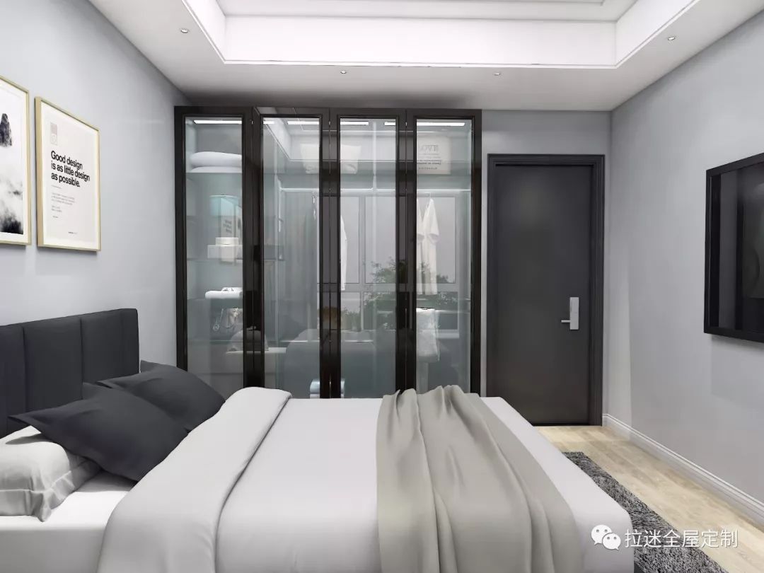 兩個(gè)臥室采用了不同的衣柜設(shè)計(jì)。一個(gè)以封閉式為主,另一個(gè)則是開(kāi)放式為主,還加入了電視柜。