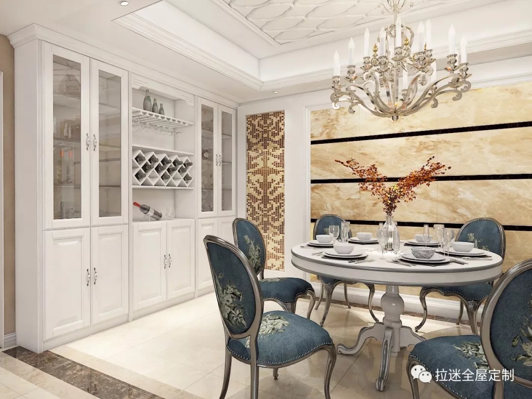 餐邊柜在設(shè)計(jì)時(shí)將酒柜結(jié)合其中,既滿足了餐邊柜的儲(chǔ)物功能,也滿足了酒柜的展示功能。而穿插酒柜的設(shè)計(jì)更是將主人毫無張揚(yáng)之態(tài),又不失自信之姿的品質(zhì)表達(dá)的淋漓盡致。