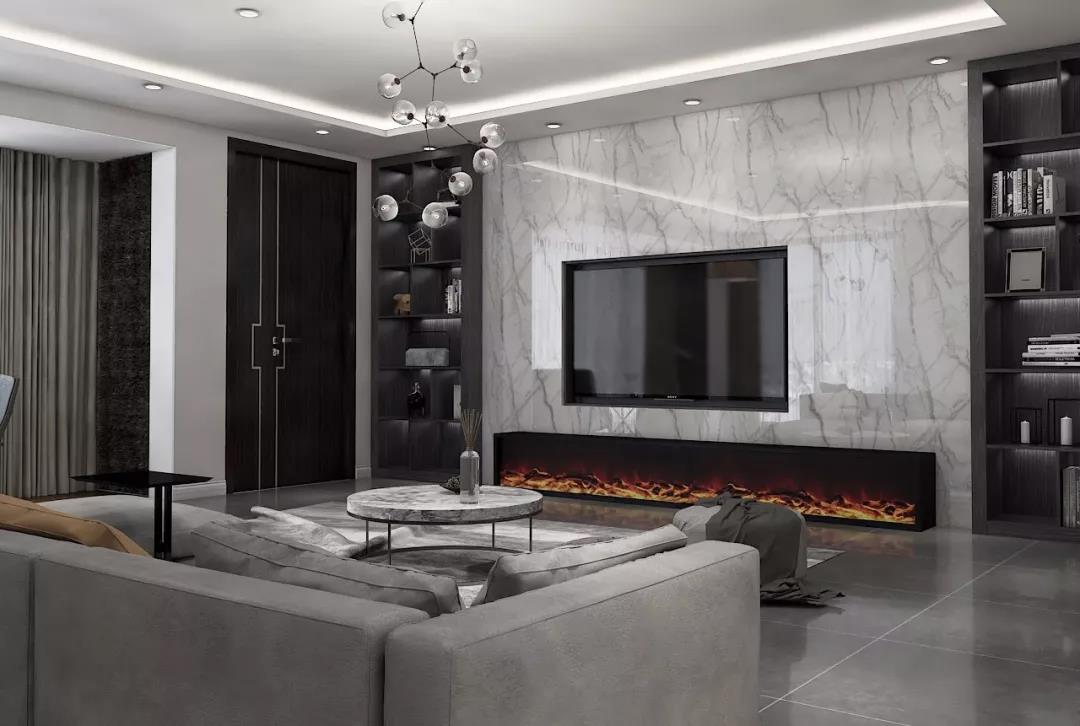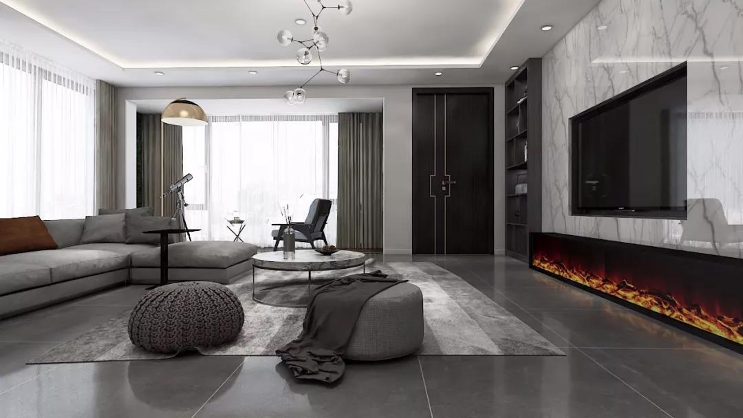 寬敞的客廳沒有過多的修飾,讓一切看起來都是那么的剛好,白色大理石背景墻與極具時代性壁爐結(jié)合,黑色的柜體,營造出極簡平衡而又獨特的美感。大面的落地窗擁有極佳的視野,黑白灰色調(diào)的運用賦予了空間獨特的雅韻和品質(zhì)感。