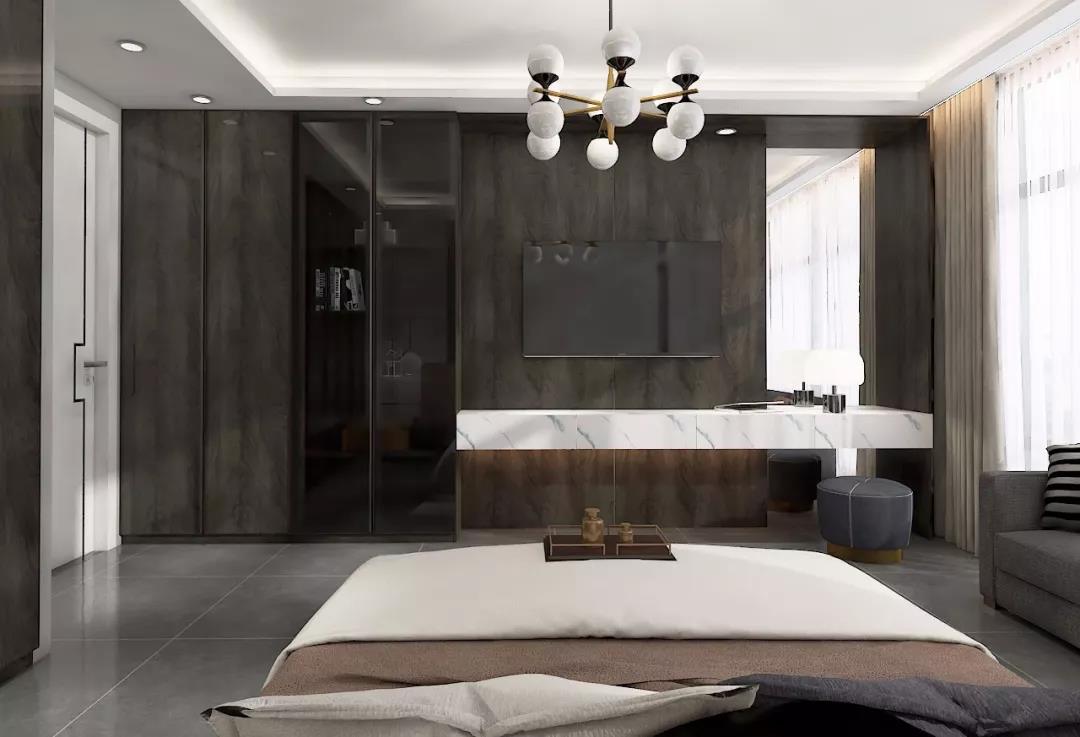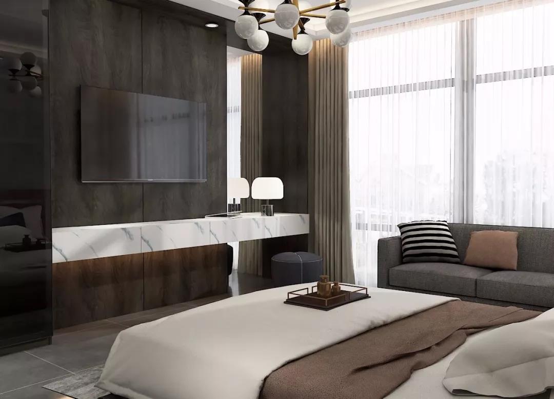 電視柜+梳妝臺的設計,加上大理石元素的運用,臺面下及窗簾盒內(nèi)燈光的運用,自然光與人造光疊加,使整個空間更加靈動。
