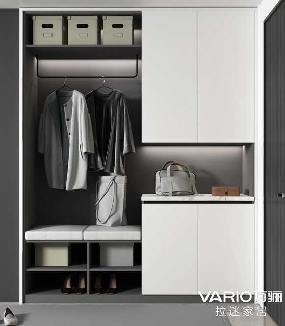 玄關(guān)柜上下分層設(shè)計(jì),再加上掛衣區(qū)與換鞋凳,面積不大卻功能齊全