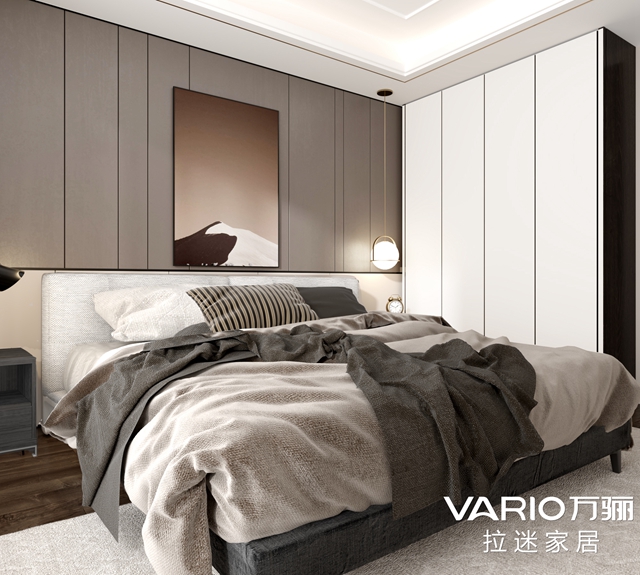 主臥要的就是簡(jiǎn)潔大氣,一柜到頂不拼接,同色系背景墻點(diǎn)綴以金屬線條,溫馨中不乏時(shí)尚