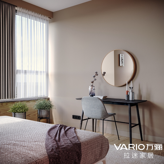 床尾不似一般裝修的電視柜,而是搭配了輕便的桌椅和圓鏡,一個(gè)簡(jiǎn)單又不失溫馨的梳妝臺(tái)就形成了